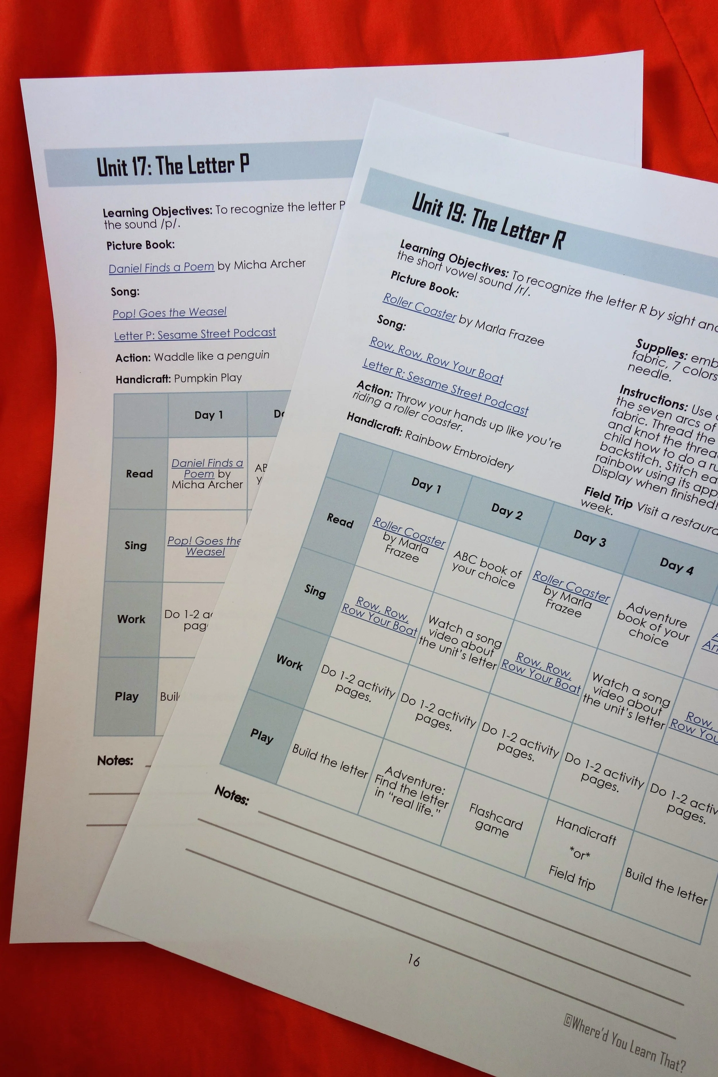 -Weekly Schedules detailing the 4 steps of this program: Read, Sing, Work, and Play